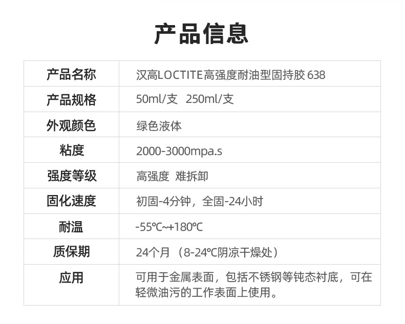 是一種高粘合強度的圓柱形配合件固持膠。它可以填充圓柱形部件間的所有間隙并固化形成堅硬的熱固性塑料使部件結(jié)合成一整體,防止沖擊和振動引起的松動和泄漏。該產(chǎn)品在所有金屬表面上均可實現(xiàn)高強度,包括不銹鋼等鈍態(tài)襯底同時,該產(chǎn)品也具有耐受表面輕微污染的特性。