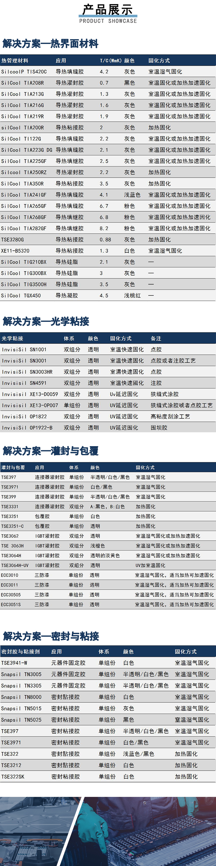 電池模組:密封粘接、包覆、熱管理(灌封材料、填縫膠、粘接膠)。