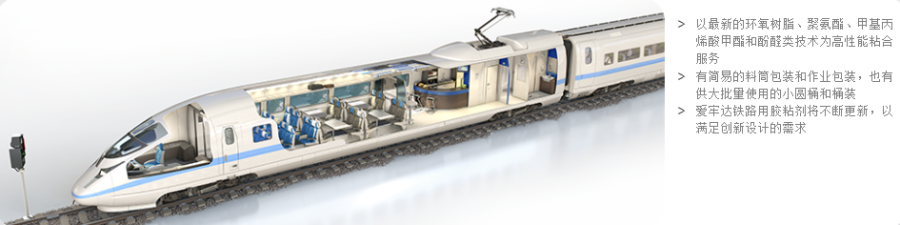 在歐洲,由于對道路流動性的需求、提高能源消耗效率和關注氣候變化問題的聲音日漸強烈,交通議題主要側重于打造鐵路為運輸主力。因此,高性能膠粘劑便大派用場。愛牢達以其備深業界歡迎的解決方案和獨具創新的、高新技術產品為鐵路工業各個領域提供服務。
