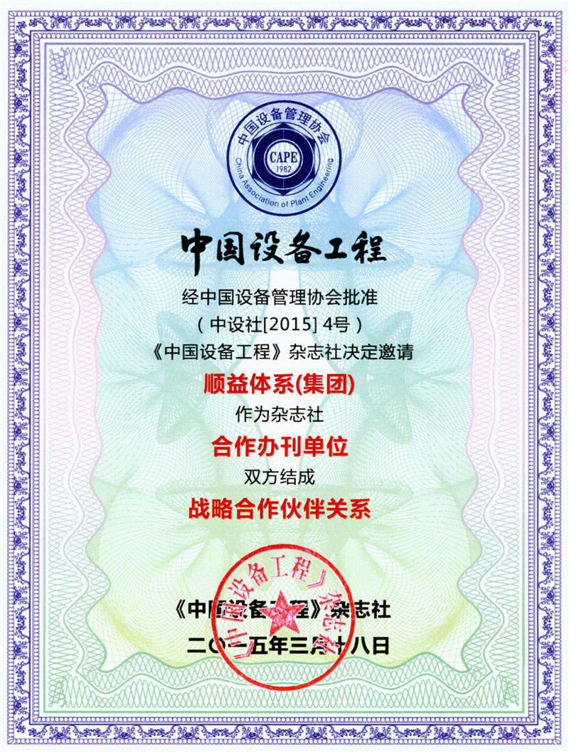 會議上,《中國設備工程》雜志社正式授予順益體系(集團)合作辦刊單位&戰略合作伙伴牌匾。2015年3月18日,經中國設備管理協會批準,順益體系(集團)正式成為《中國設備工程》雜志社唯一合作辦刊單位,簽署了戰略合作協議,建立起全面的戰略合作伙伴關系。順益體系(集團)經授權成立《中國設備工程》雜志社廣東省工作站,協助《中國設備工程》雜志社開展廣告及發行等相關業務,與《中國設備工程》雜志社的合作將促進公司更快速地了解行業的發展動態及更專業地掌握相關領域的前沿技術。