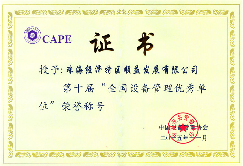 為第十屆全國設備管理先進單位“珠海經濟特區順益發展有限公司”頒發獎牌和證書
