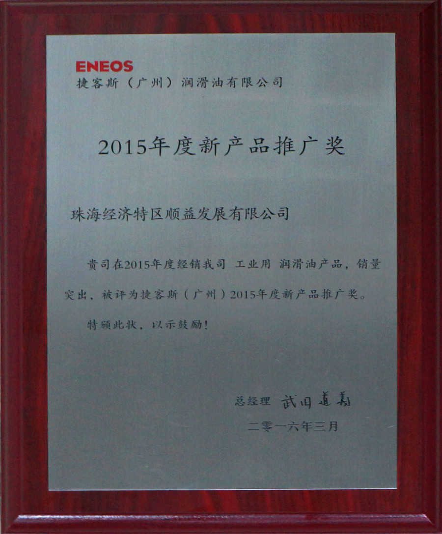順益體系(集團)在與JX集團多年友好合作中,已連續4年獲得了“捷客斯(廣州)年度金牌代理店”榮譽。在本次大會上,2015年,順益在新產品推廣及業績表現突出,榮獲了2015年度新產品推廣獎和2015年特別貢獻獎兩項大獎。